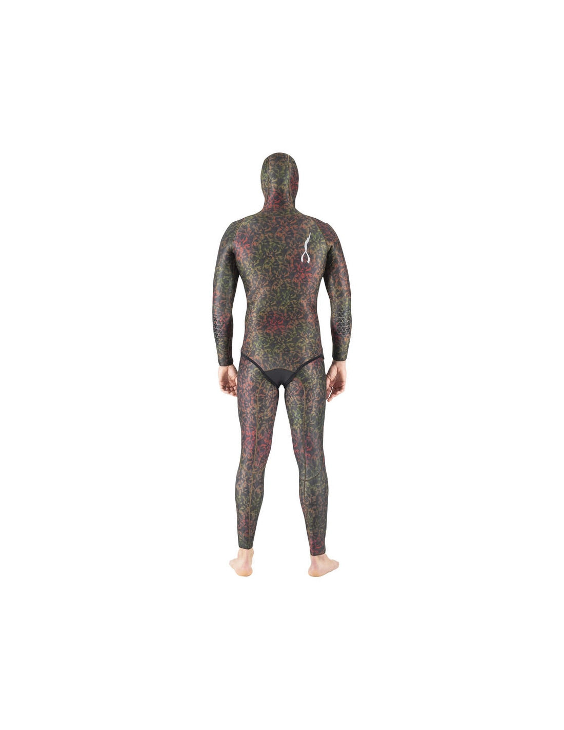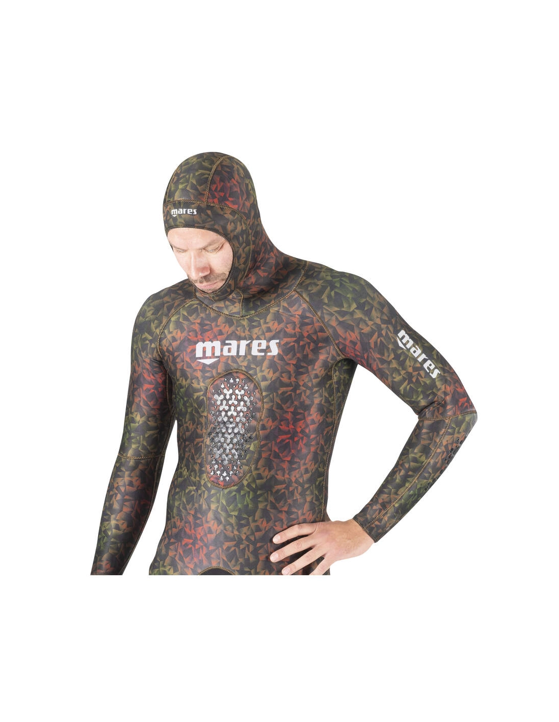 • Design de camuflagem poligonal em tons índigo e castanho que torna o pescador submarino “invisível”