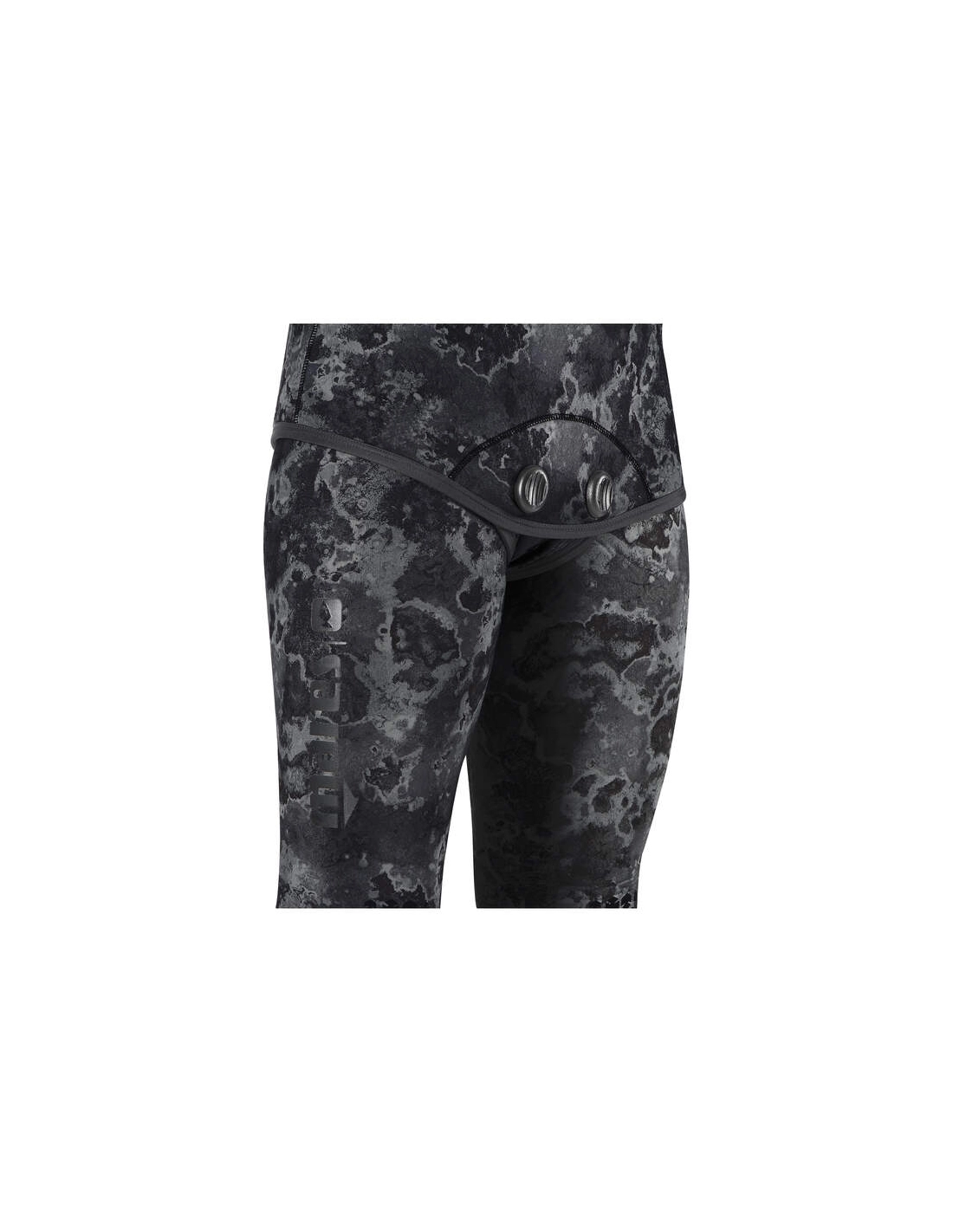 A parte superior do fato Explorer Camo Black 70 proporciona uma camuflagem eficaz graças ao padrão camuflado preto impresso sobre forro cinzento. Inclui reforço esternal antiderrapante e interior em neoprene com efeito amortecedor.