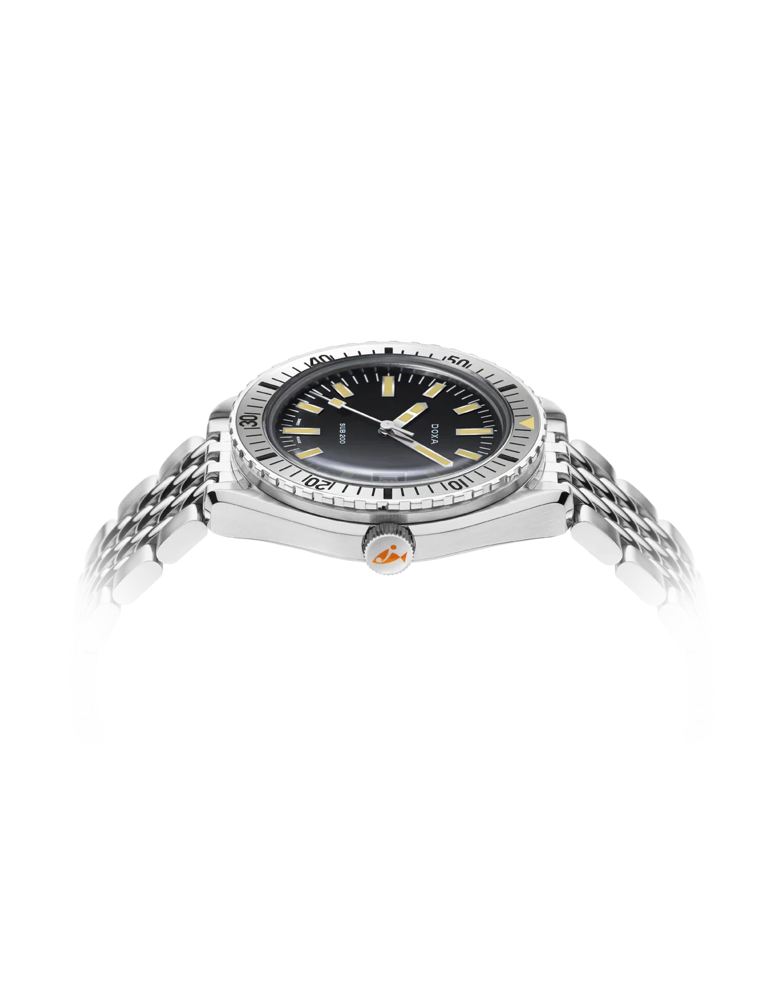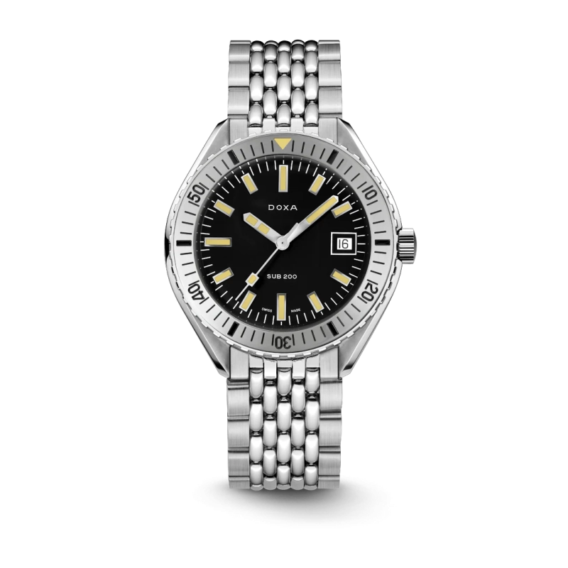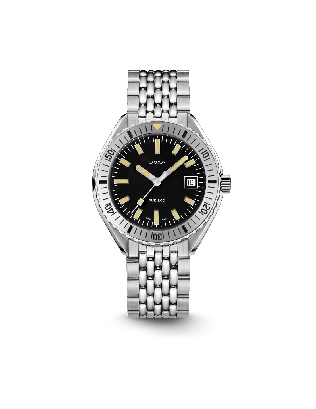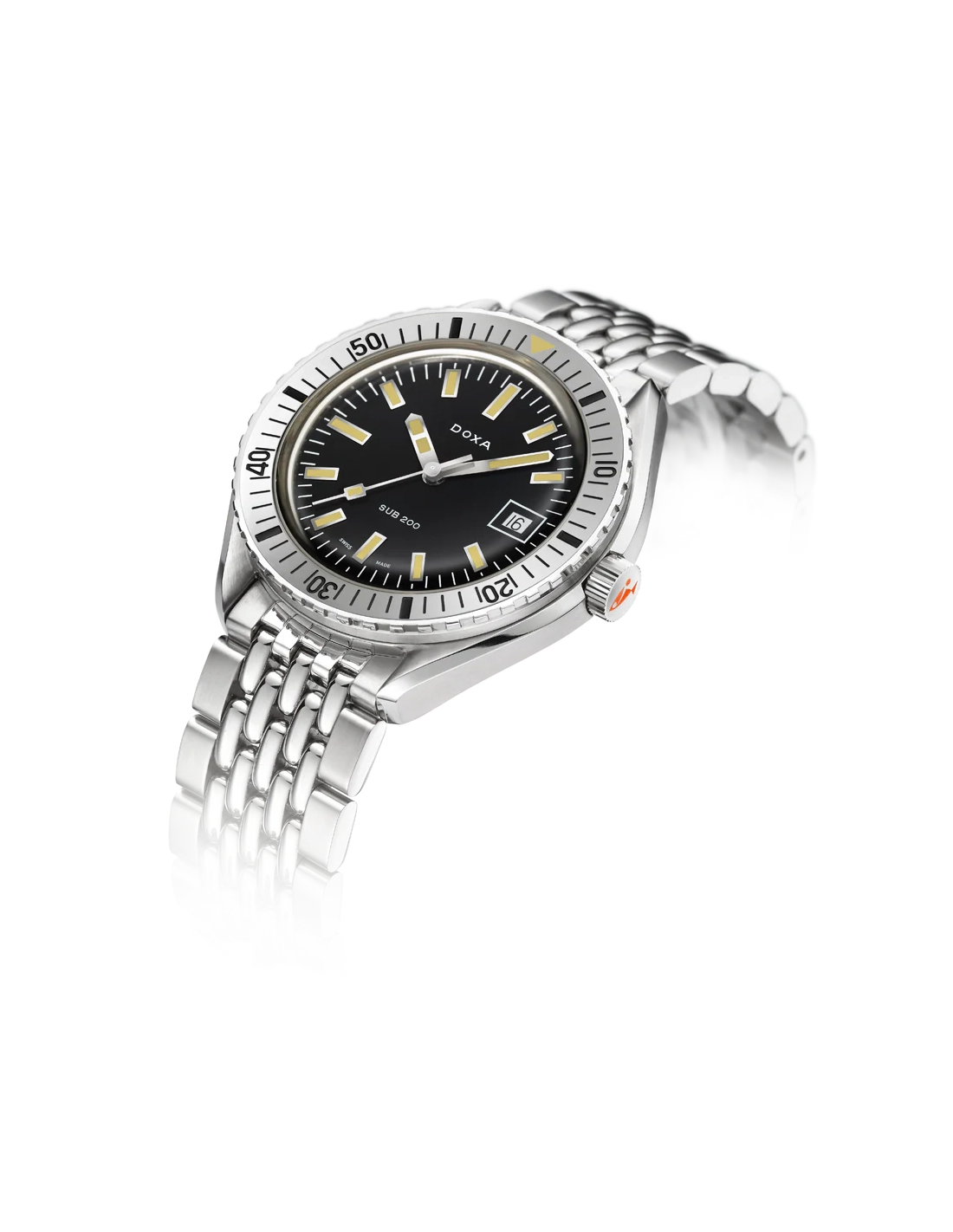 Revelado na Baselworld 2019, este relógio de mergulho de três ponteiros apresenta uma caixa em aço inoxidável 316L da mais alta qualidade. Com um diâmetro de 42 mm, o SUB 200 é equipado com um vidro de safira resistente a riscos, com revestimento antirreflexo e a curvatura distinta do plexiglass abobadado utilizado antigamente. Resistente à água até uma profundidade de 200 metros (20 ATM), o modelo inclui uma luneta rotativa unidirecional. Todos os elementos que fornecem informações relevantes para o mergulho, incluindo a luneta, possuem revestimento luminescente Super-LumiNova®. A bracelete é em aço inoxidável 316L e inclui um fecho dobrável com o símbolo do peixe DOXA.