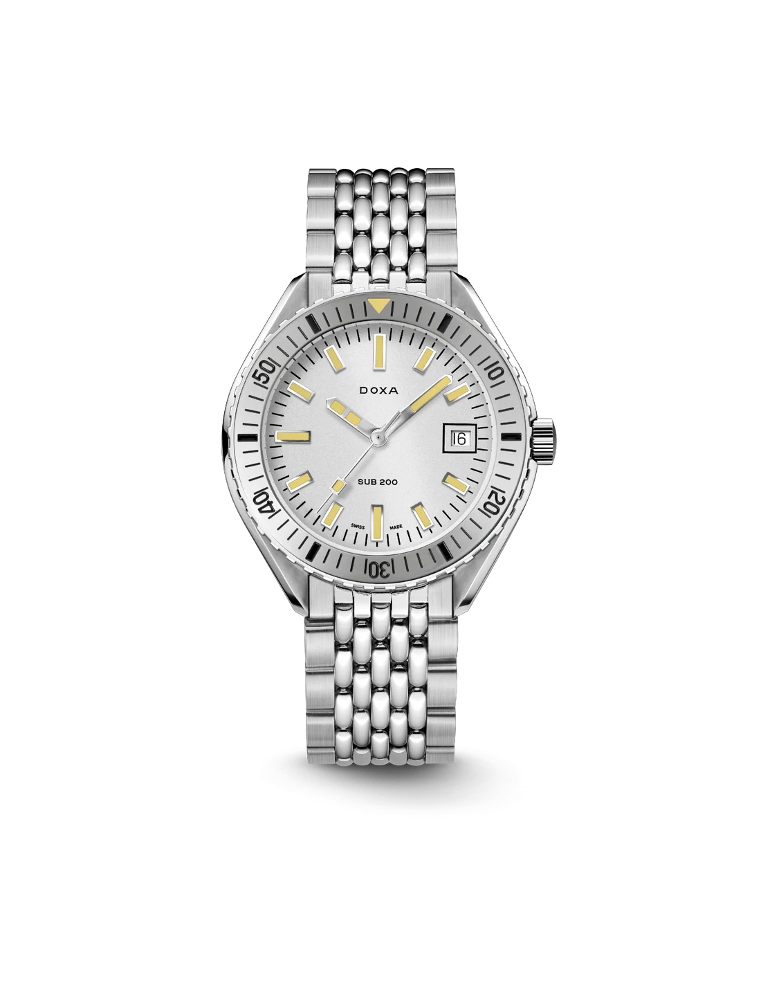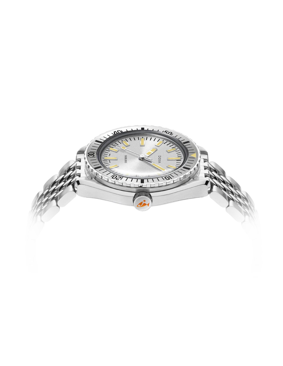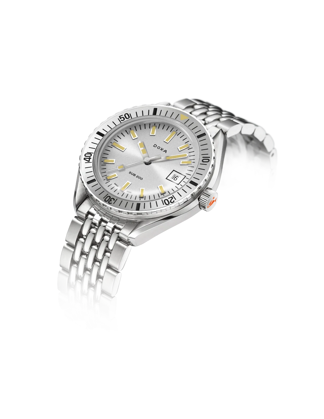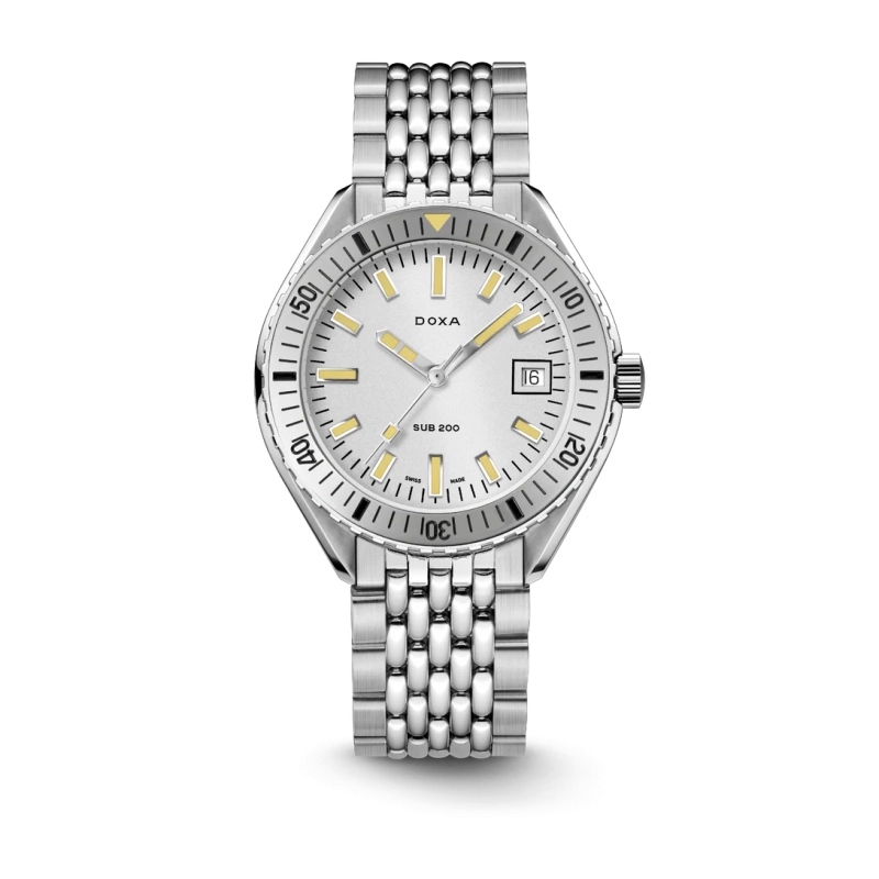 Revelado na Baselworld 2019, este relógio de mergulho de três ponteiros apresenta uma caixa em aço inoxidável 316L da mais alta qualidade. Com um diâmetro de 42 mm, o SUB 200 é equipado com um vidro de safira resistente a riscos, com revestimento antirreflexo e a curvatura distinta do plexiglass abobadado utilizado antigamente. Resistente à água até uma profundidade de 200 metros (20 ATM), o modelo inclui uma luneta rotativa unidirecional. Todos os elementos que fornecem informações relevantes para o mergulho, incluindo a luneta, possuem revestimento luminescente Super-LumiNova®. A bracelete é em aço inoxidável 316L e inclui um fecho dobrável com o símbolo do peixe DOXA.