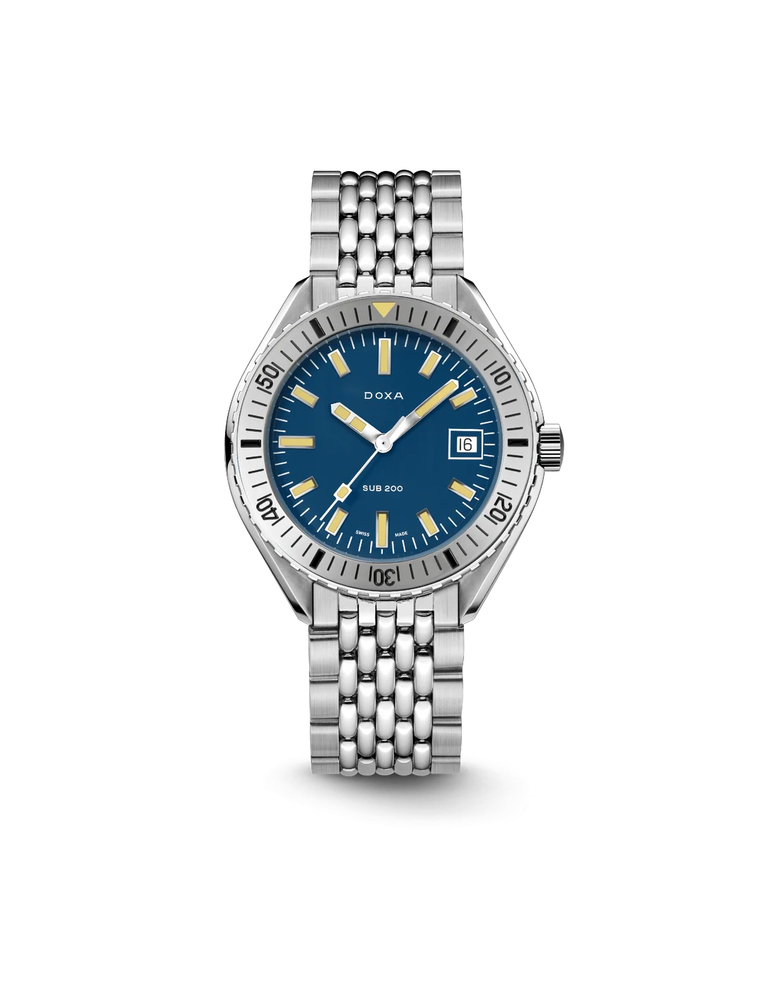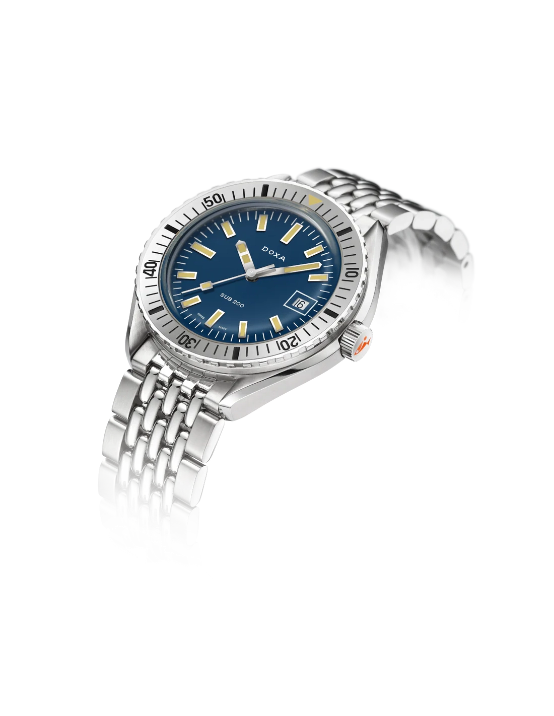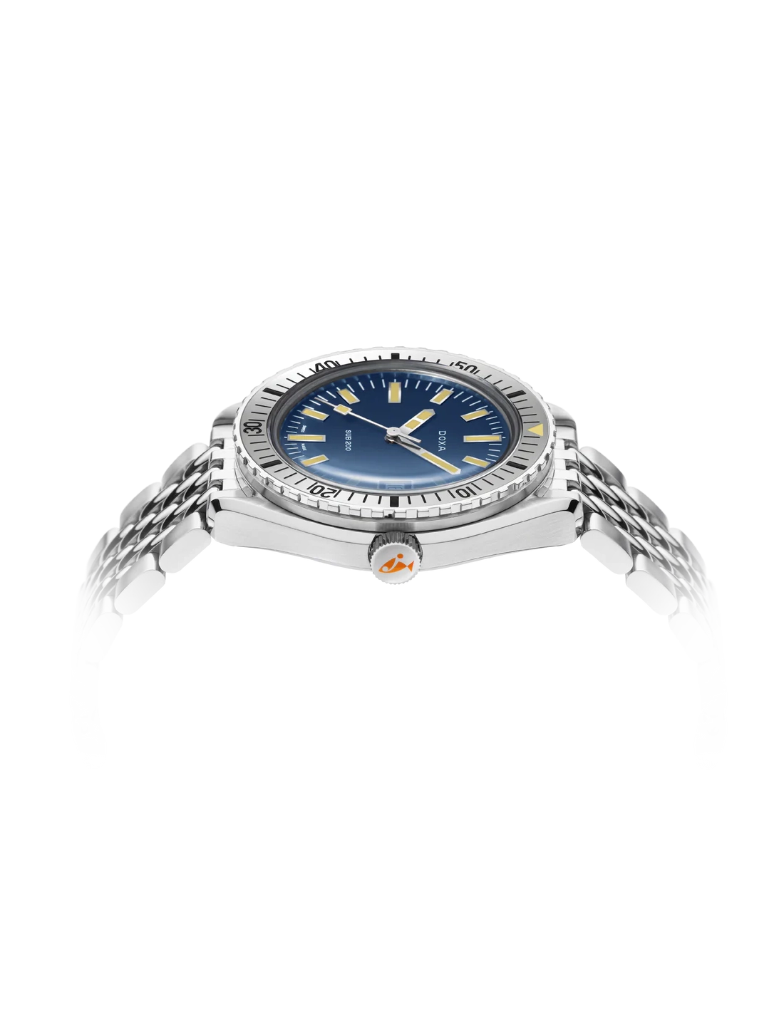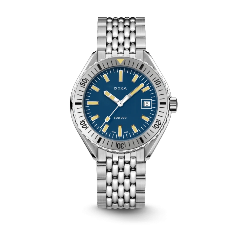 Revelado na Baselworld 2019, este relógio de mergulho de três ponteiros apresenta uma caixa em aço inoxidável 316L da mais alta qualidade. Com um diâmetro de 42 mm, o SUB 200 é equipado com um vidro de safira resistente a riscos, com revestimento antirreflexo e a curvatura distinta do plexiglass abobadado utilizado antigamente. Resistente à água até uma profundidade de 200 metros (20 ATM), o modelo inclui uma luneta rotativa unidirecional. Todos os elementos que fornecem informações relevantes para o mergulho, incluindo a luneta, possuem revestimento luminescente Super-LumiNova®. A bracelete é em aço inoxidável 316L e inclui um fecho dobrável com o símbolo do peixe DOXA.