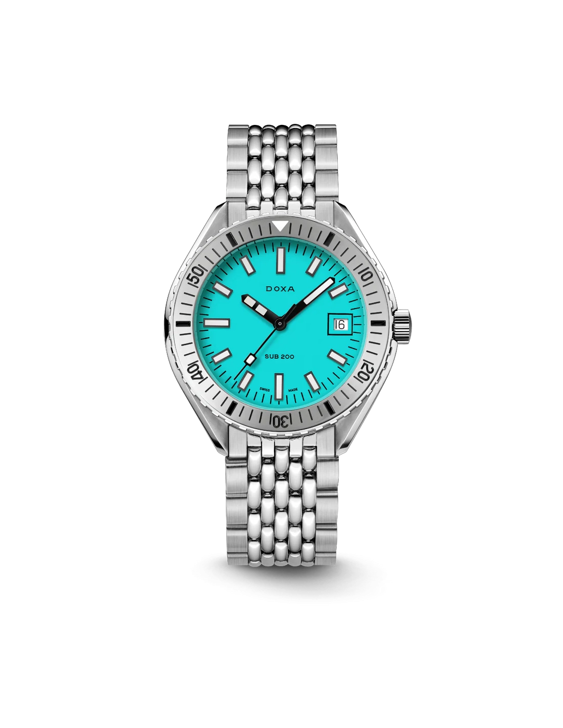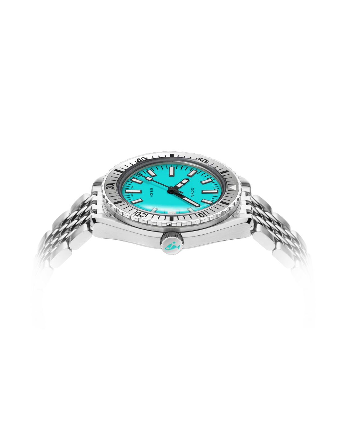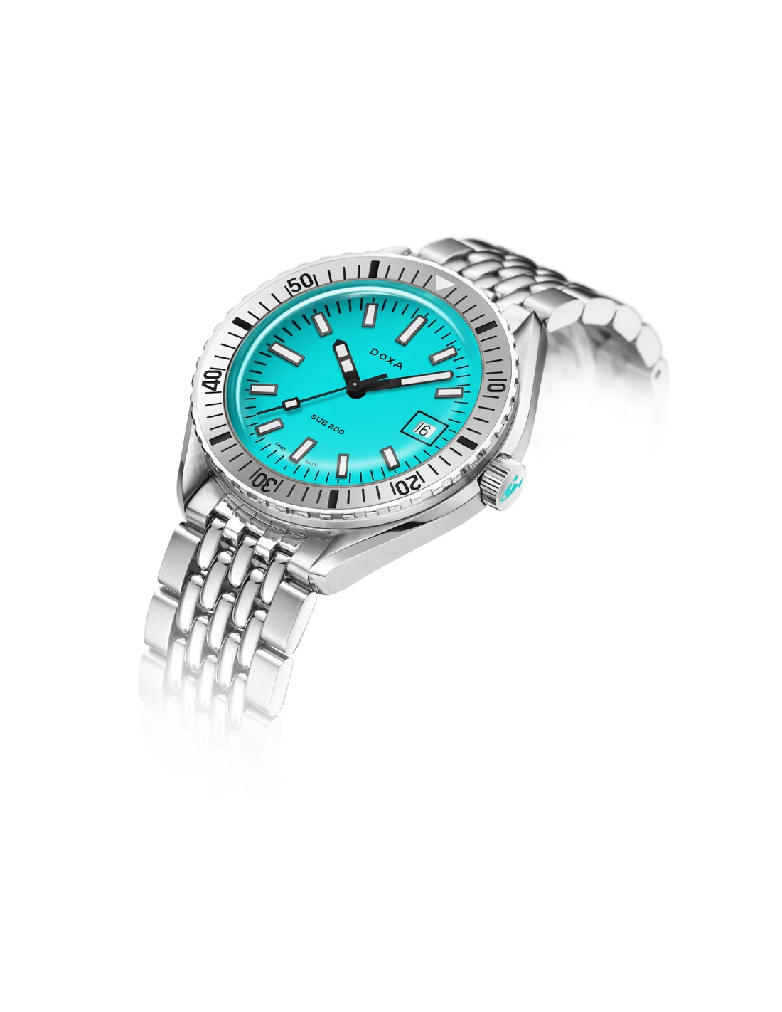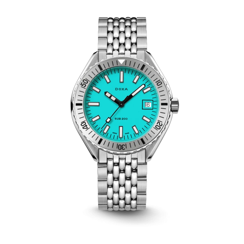 Revelado na Baselworld 2019, este relógio de mergulho de três ponteiros apresenta uma caixa em aço inoxidável 316L da mais alta qualidade. Com um diâmetro de 42 mm, o SUB 200 é equipado com um vidro de safira resistente a riscos, com revestimento antirreflexo e a curvatura distinta do plexiglass abobadado utilizado antigamente. Resistente à água até uma profundidade de 200 metros (20 ATM), o modelo inclui uma luneta rotativa unidirecional. Todos os elementos que fornecem informações relevantes para o mergulho, incluindo a luneta, possuem revestimento luminescente Super-LumiNova®. A bracelete é em aço inoxidável 316L e inclui um fecho dobrável com o símbolo do peixe DOXA.