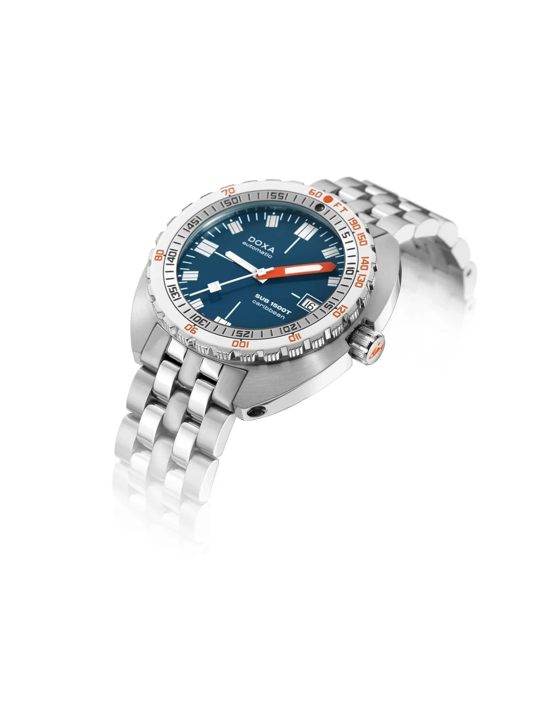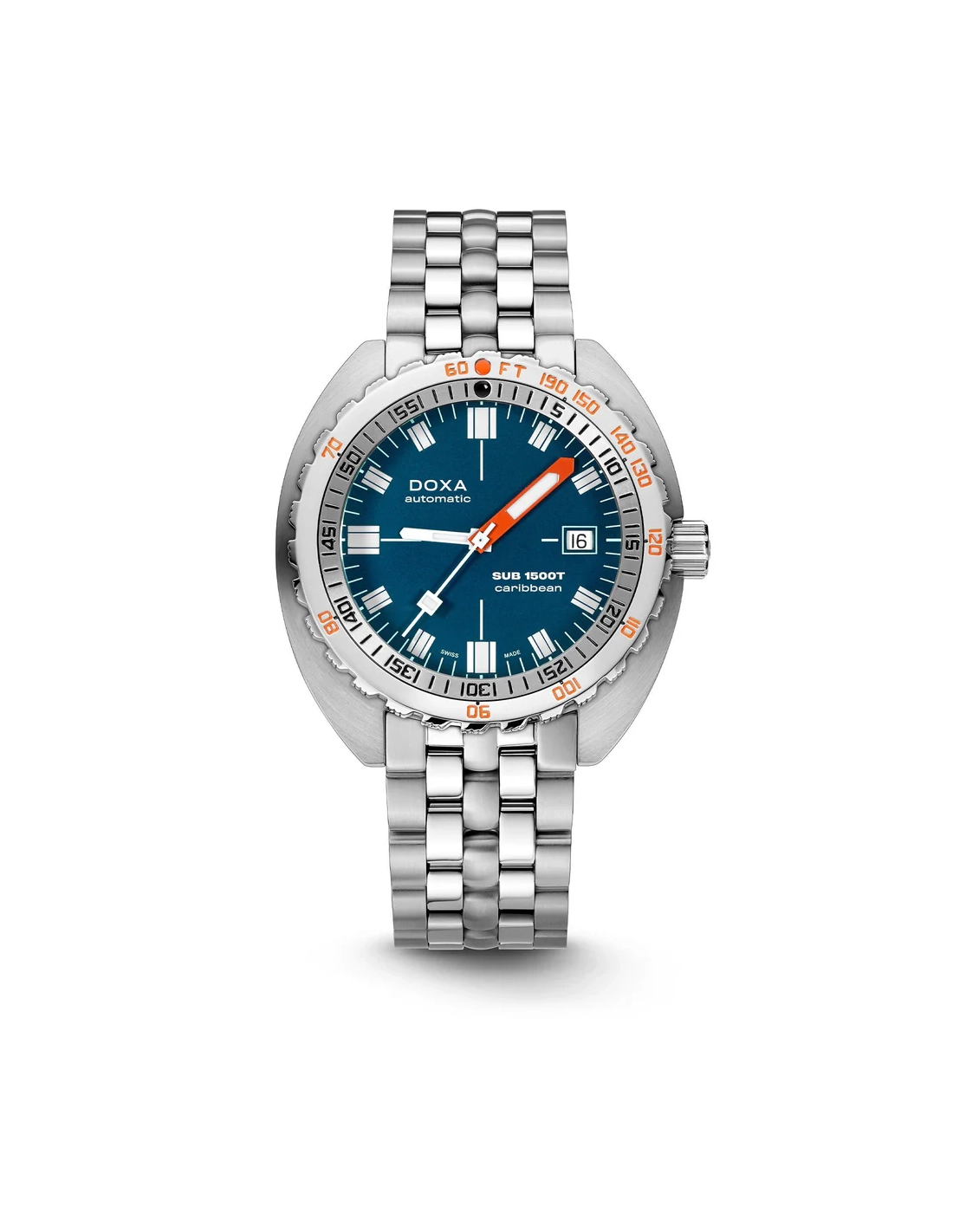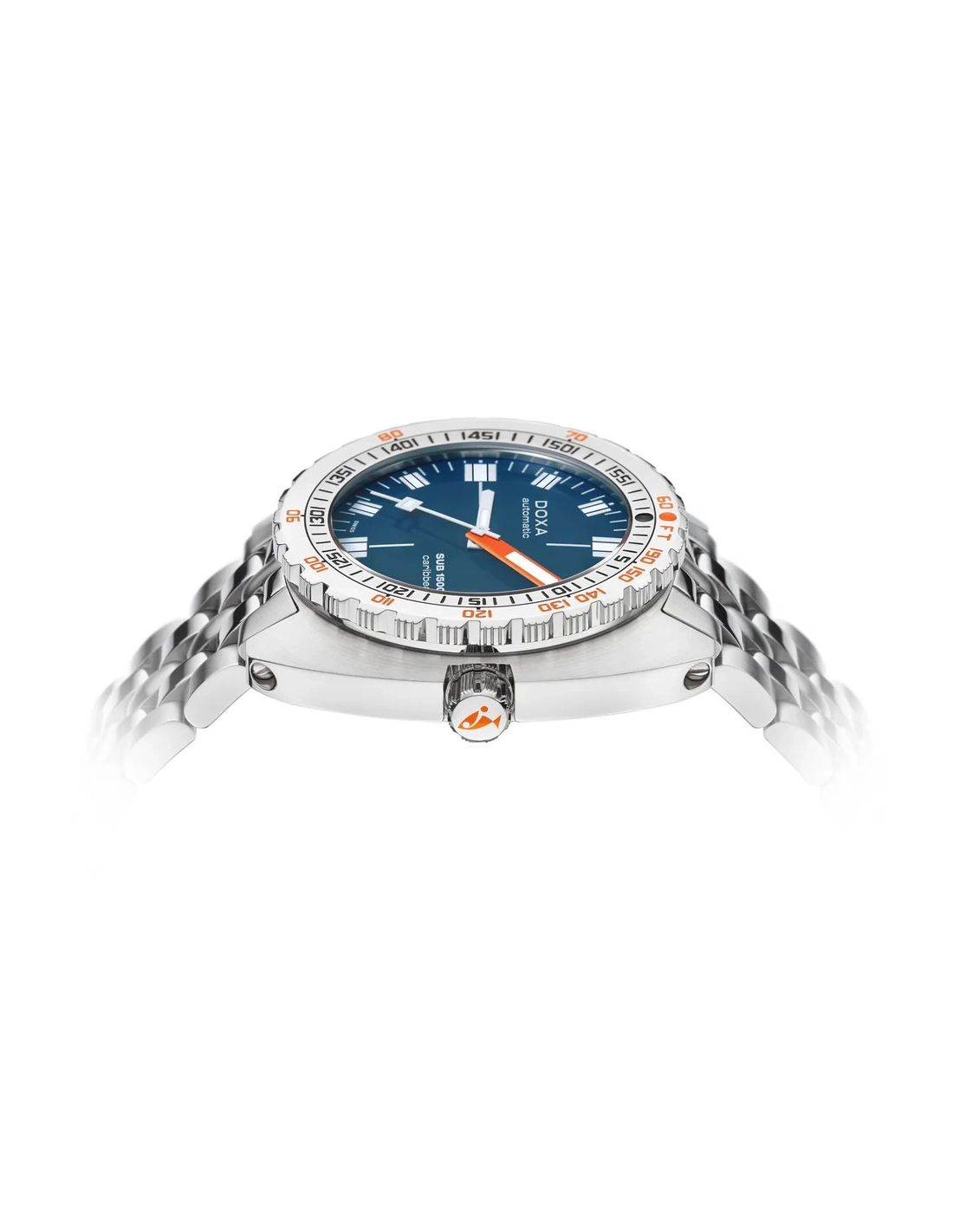 A sua caixa, em formato “cushion”, é fabricada em aço inoxidável 316L de altíssima qualidade. Com um diâmetro de 45,00 mm, o SUB 1500T está classificado para 160 ATM, permitindo mergulhos até profundidades de 1.500 metros. Em homenagem ao SUB 300T Conquistador, apresenta a mesma luneta rotativa unidirecional patenteada e a válvula de escape de hélio integrada do seu lendário antecessor. Todos os elementos que fornecem informações essenciais para o mergulho estão equipados com revestimento luminescente Super-LumiNova®, garantindo excelente legibilidade debaixo de água. A bracelete é em aço inoxidável 316L e inclui um fecho dobrável com o símbolo do peixe DOXA.