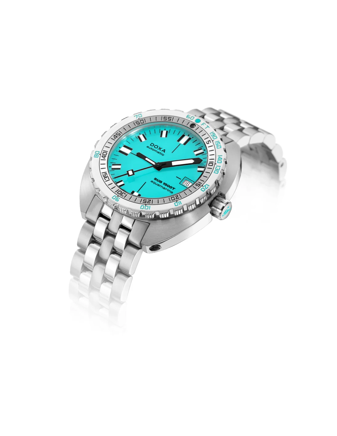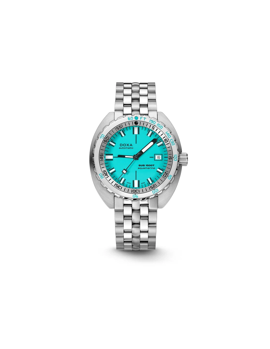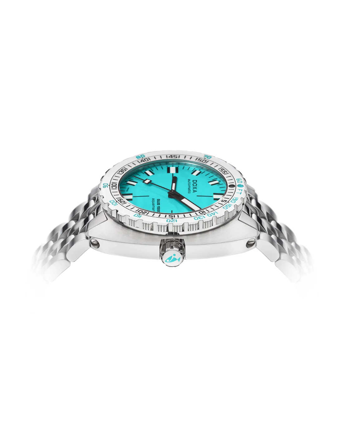 A sua caixa, em formato “cushion”, é fabricada em aço inoxidável 316L de altíssima qualidade. Com um diâmetro de 45,00 mm, o SUB 1500T está classificado para 160 ATM, permitindo mergulhos até profundidades de 1.500 metros. Em homenagem ao SUB 300T Conquistador, apresenta a mesma luneta rotativa unidirecional patenteada e a válvula de escape de hélio integrada do seu lendário antecessor. Todos os elementos que fornecem informações essenciais para o mergulho estão equipados com revestimento luminescente Super-LumiNova®, garantindo excelente legibilidade debaixo de água. A bracelete é em aço inoxidável 316L e inclui um fecho dobrável com o símbolo do peixe DOXA.