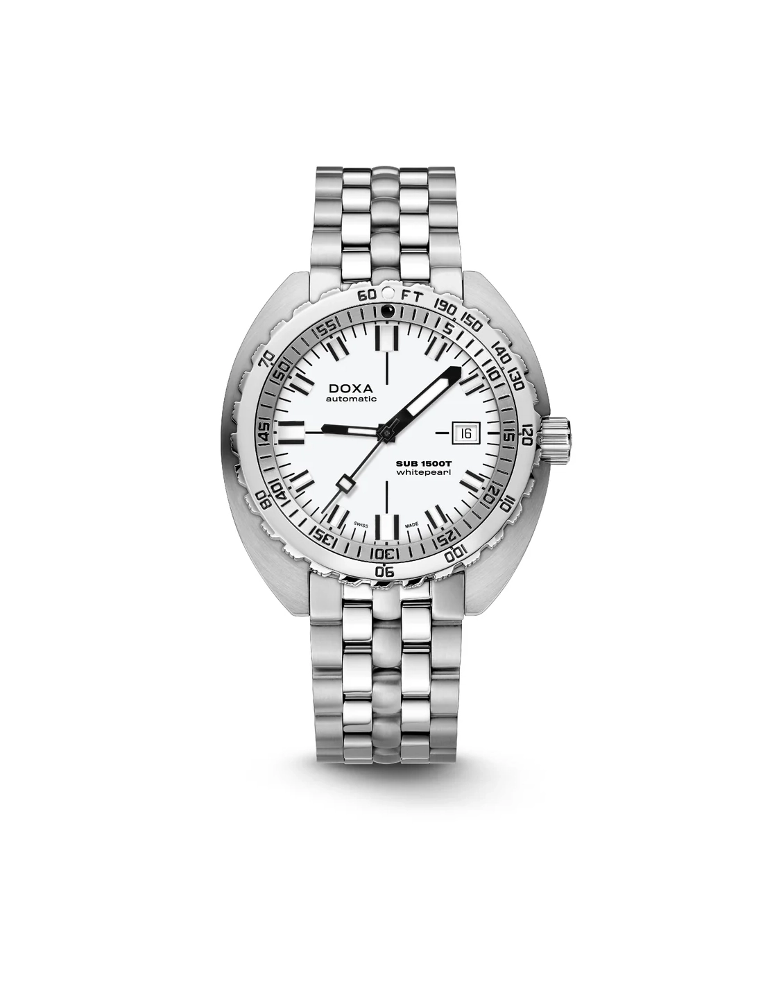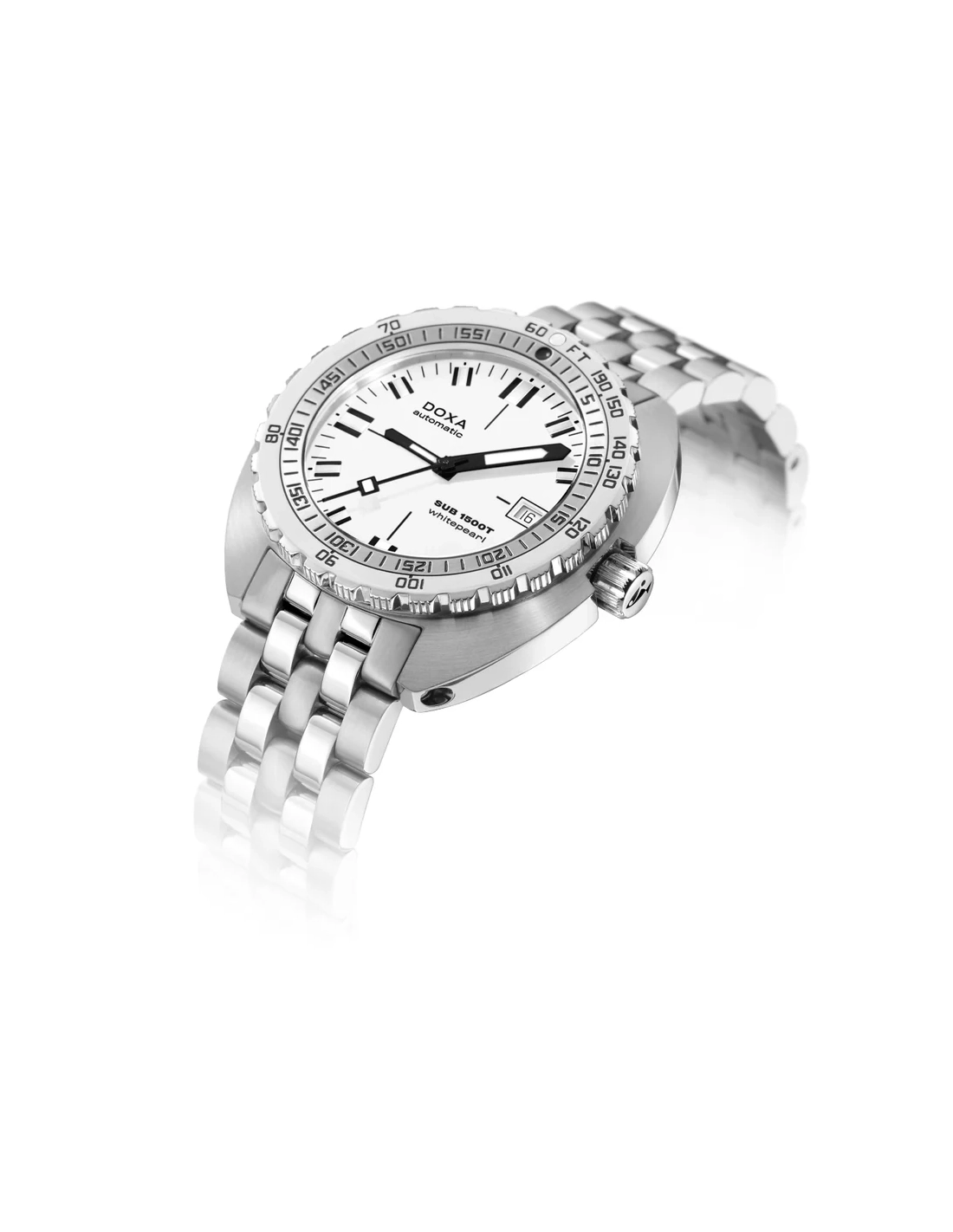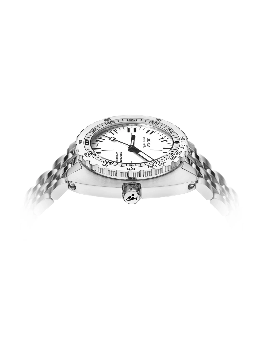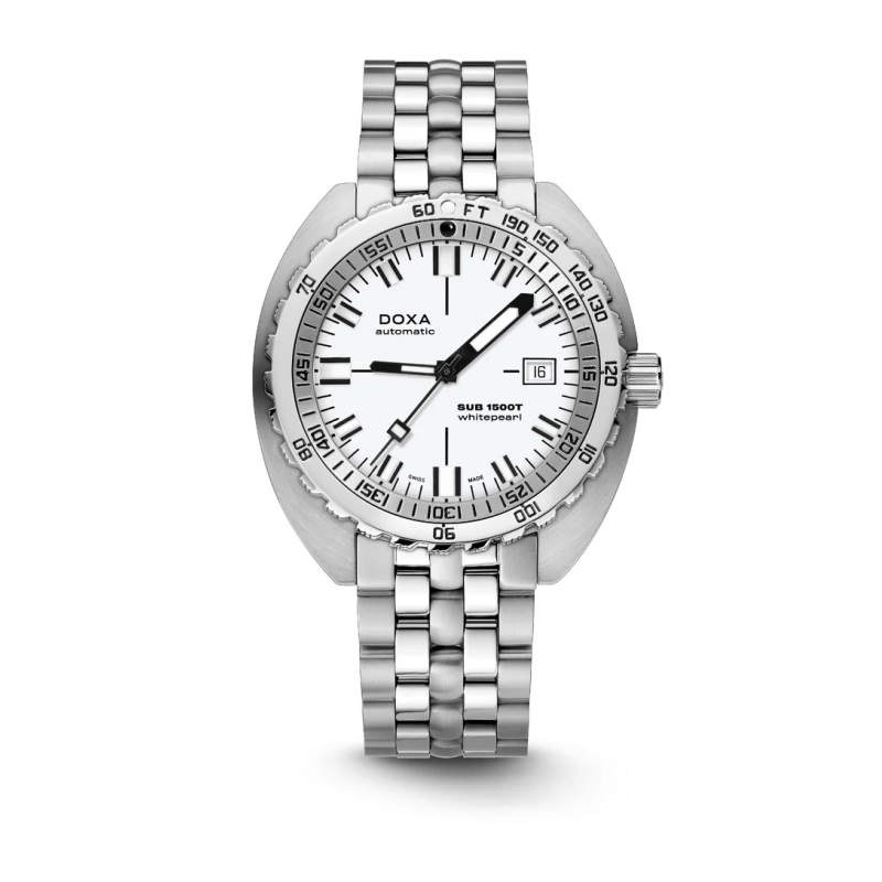 A sua caixa, em formato “cushion”, é fabricada em aço inoxidável 316L de altíssima qualidade. Com um diâmetro de 45,00 mm, o SUB 1500T está classificado para 160 ATM, permitindo mergulhos até profundidades de 1.500 metros. Em homenagem ao SUB 300T Conquistador, apresenta a mesma luneta rotativa unidirecional patenteada e a válvula de escape de hélio integrada do seu lendário antecessor. Todos os elementos que fornecem informações essenciais para o mergulho estão equipados com revestimento luminescente Super-LumiNova®, garantindo excelente legibilidade debaixo de água. A bracelete é em aço inoxidável 316L e inclui um fecho dobrável com o símbolo do peixe DOXA.