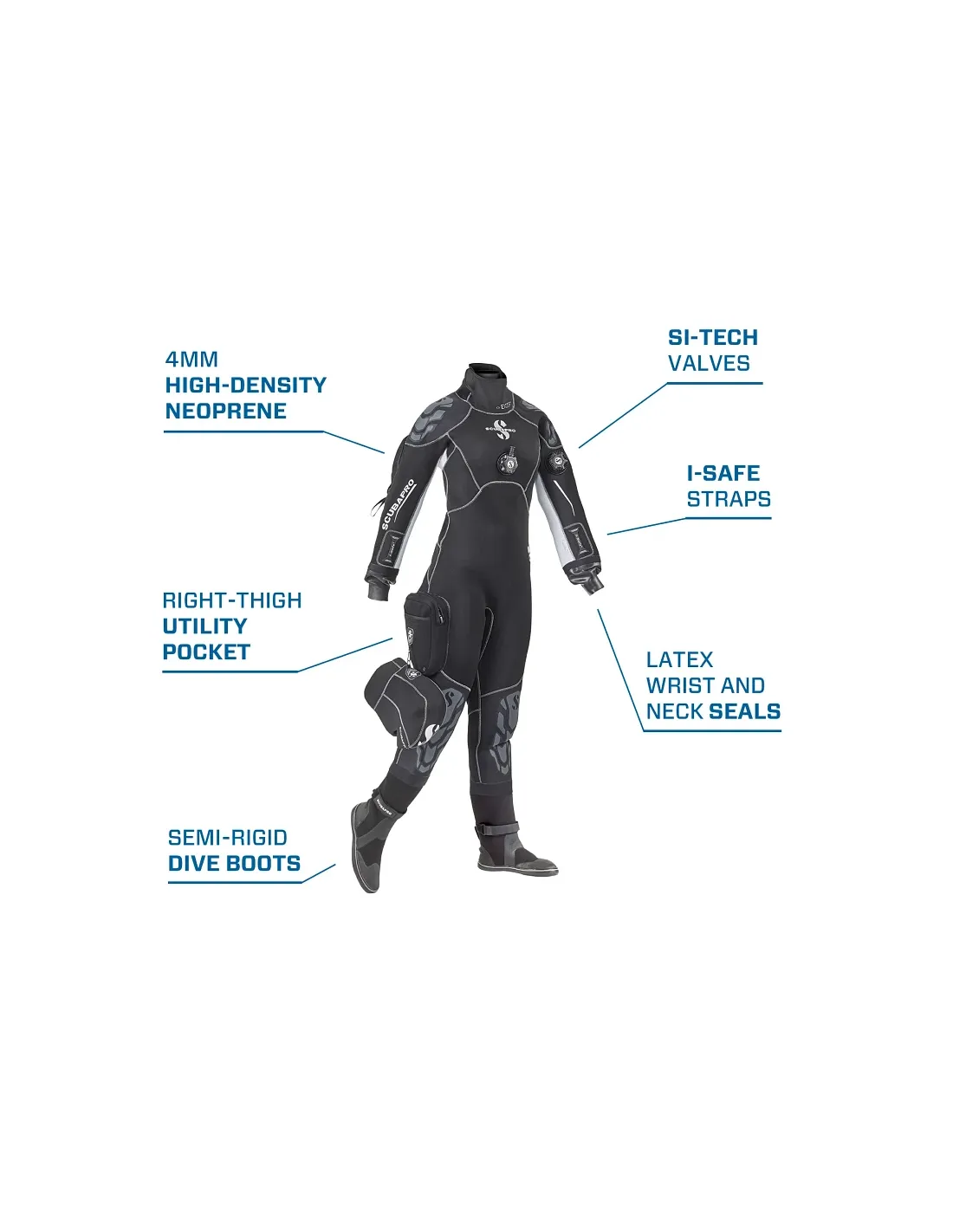 • 4 mm high-density neoprene resists compression, reducing buoyancy variations at depth. Latex wrist and neck seals are thin yet durable, providing comfortable and watertight sealing.