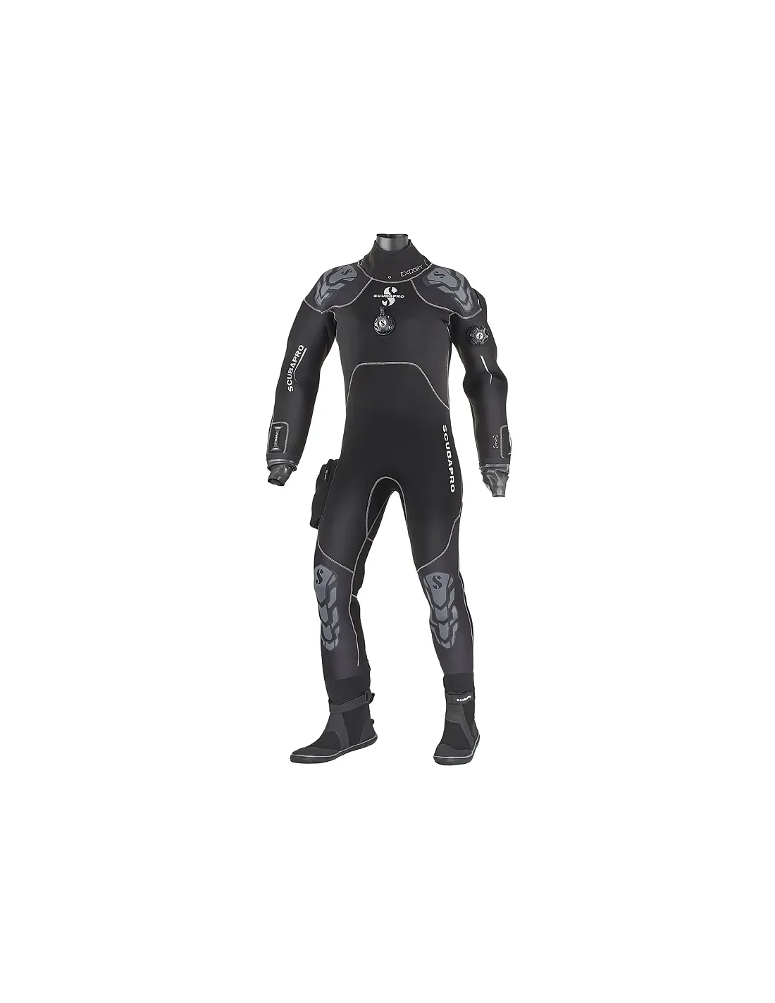 The premium-plus Exodry offers a unique approach to drysuit design by fusing 4 mm high-density neoprene with latex wrist and neck seals. This hybrid design is extremely effective, delivering minimal inherent buoyancy, maximum range of motion, and an excellent sealing system. This comfortable suit includes protective shoulder and knee panels, a plush interior lining, blue-style suspenders, and much more. For 2019, updated semi-rigid dive boots feature new soft yet protective soles and include fin strap retainers and Velcro straps to improve fit while preventing air from shifting when diving in the head-down position. The Exodry is a smart choice for all types of diving and can be used with or without an undersuit.
