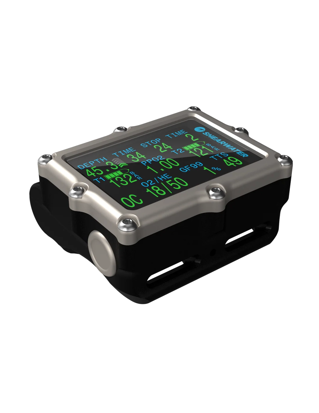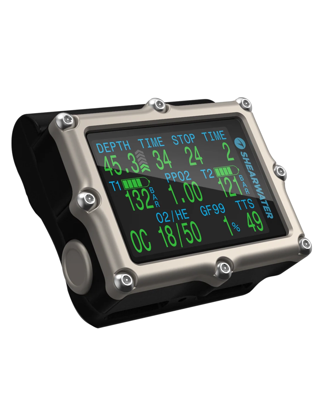 Air integration comes standard, supporting up to four Shearwater transmitters, allowing customization from open-circuit to rebreather and bailout gas pressure monitoring.