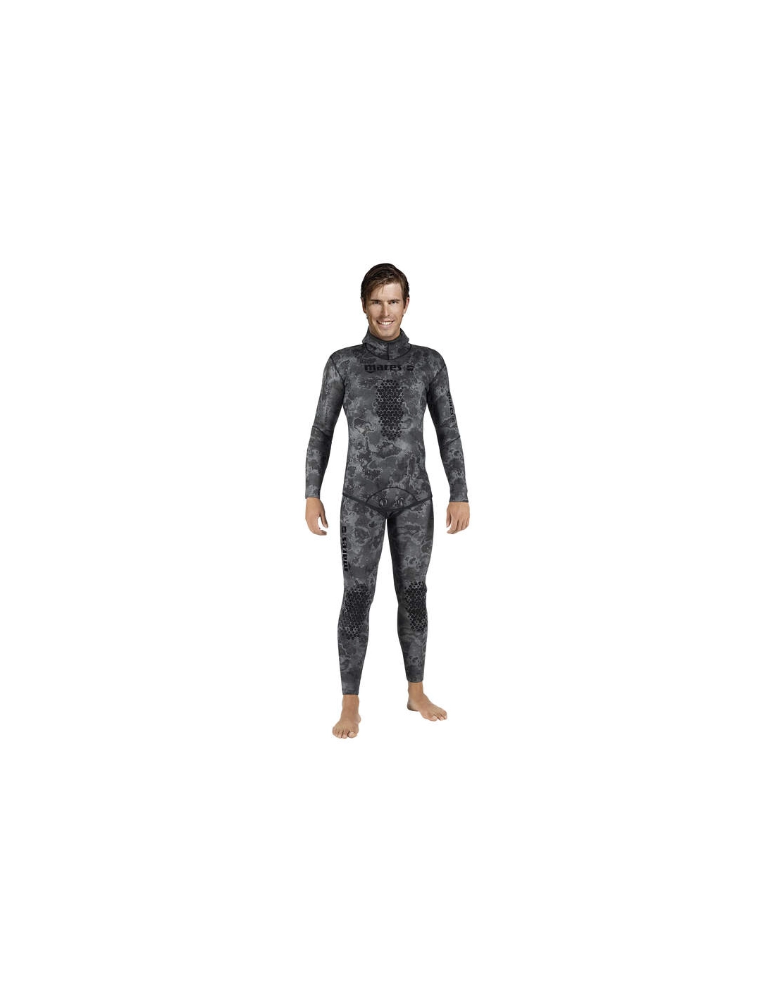 The jacket of the Explorer Camo Black 50 wetsuit provides effective camouflage thanks to a black camouflage pattern printed on a grey lining. It includes anti-slip sternal reinforcement and an internal shock-absorbing neoprene insert.