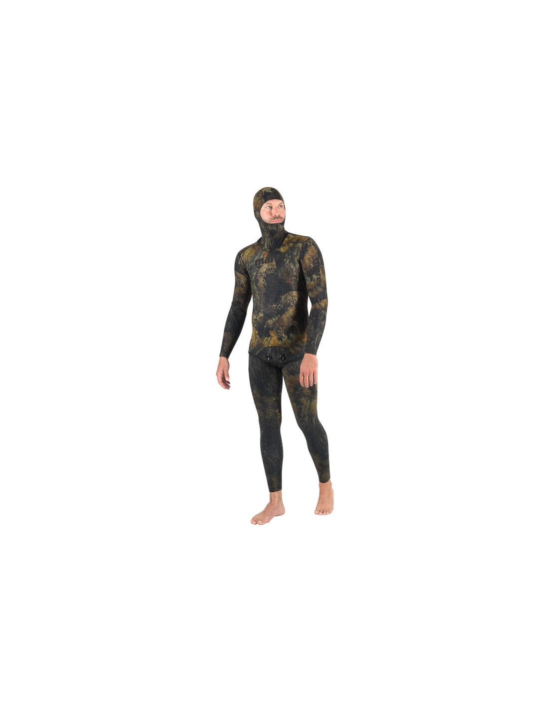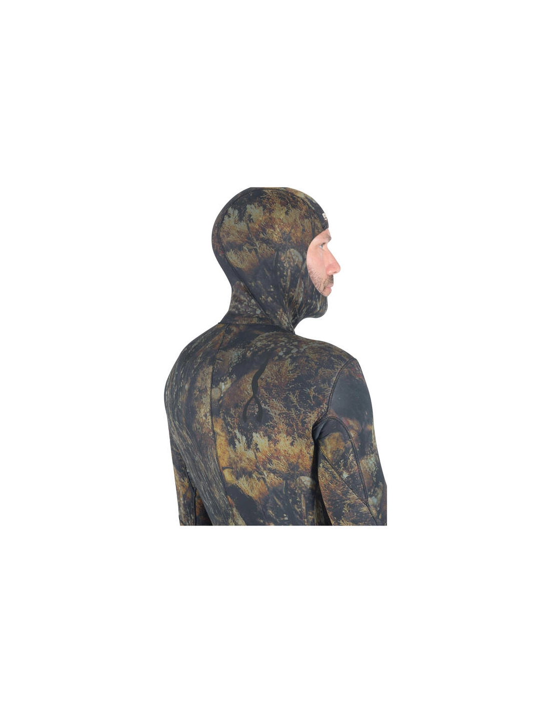 The Illusion 50 men’s freediving wetsuit jacket is made of 5 mm neoprene. The inside is made of open cell neoprene, while the exterior features a grey lining with a camouflage print inspired by the seabed.