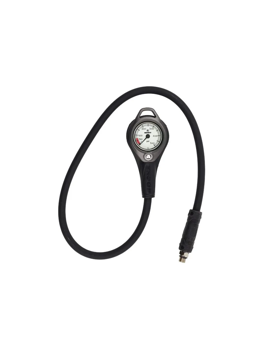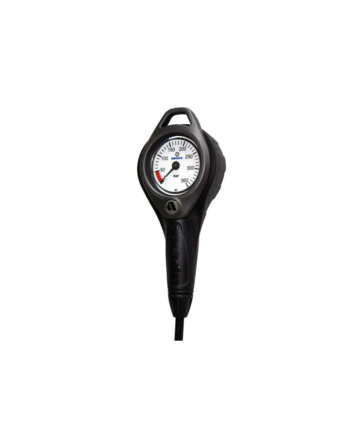 O manómetro submersível de pressão (conteúdos) da Apeks, com um mecanismo interno de medição de pressão Bourdon, fornece informações claras sobre os níveis de gás no seu cilindro. O manómetro indica a pressão da garrafa, com um mostrador que varia de zero a 360 Bar. O mostrador foi desenhado para máxima clareza, sendo limpo e com números grandes a negro sobre um fundo luminoso que oferece um efeito fosforescente prolongado. Isto torna a visualização o mais fácil possível, mesmo em condições de baixa visibilidade.
