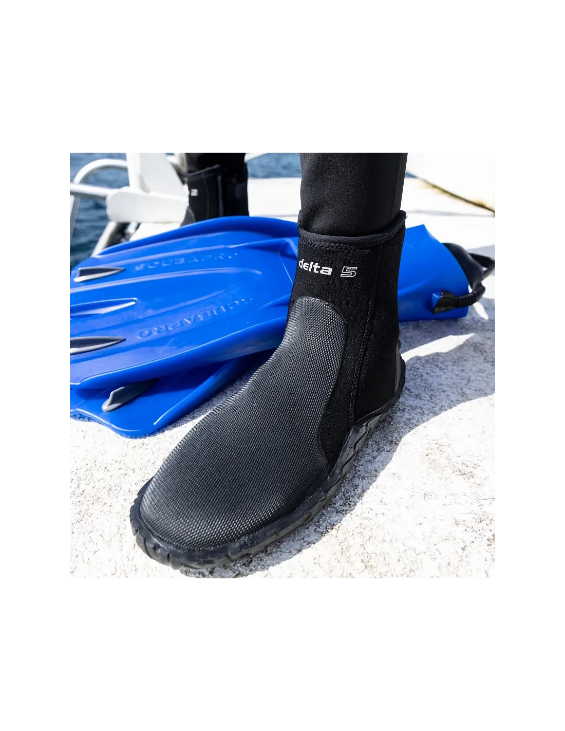 - Reforços na biqueira e no calcanhar para maior durabilidade; o calcanhar inclui suporte para a precinta da barbatanas.
